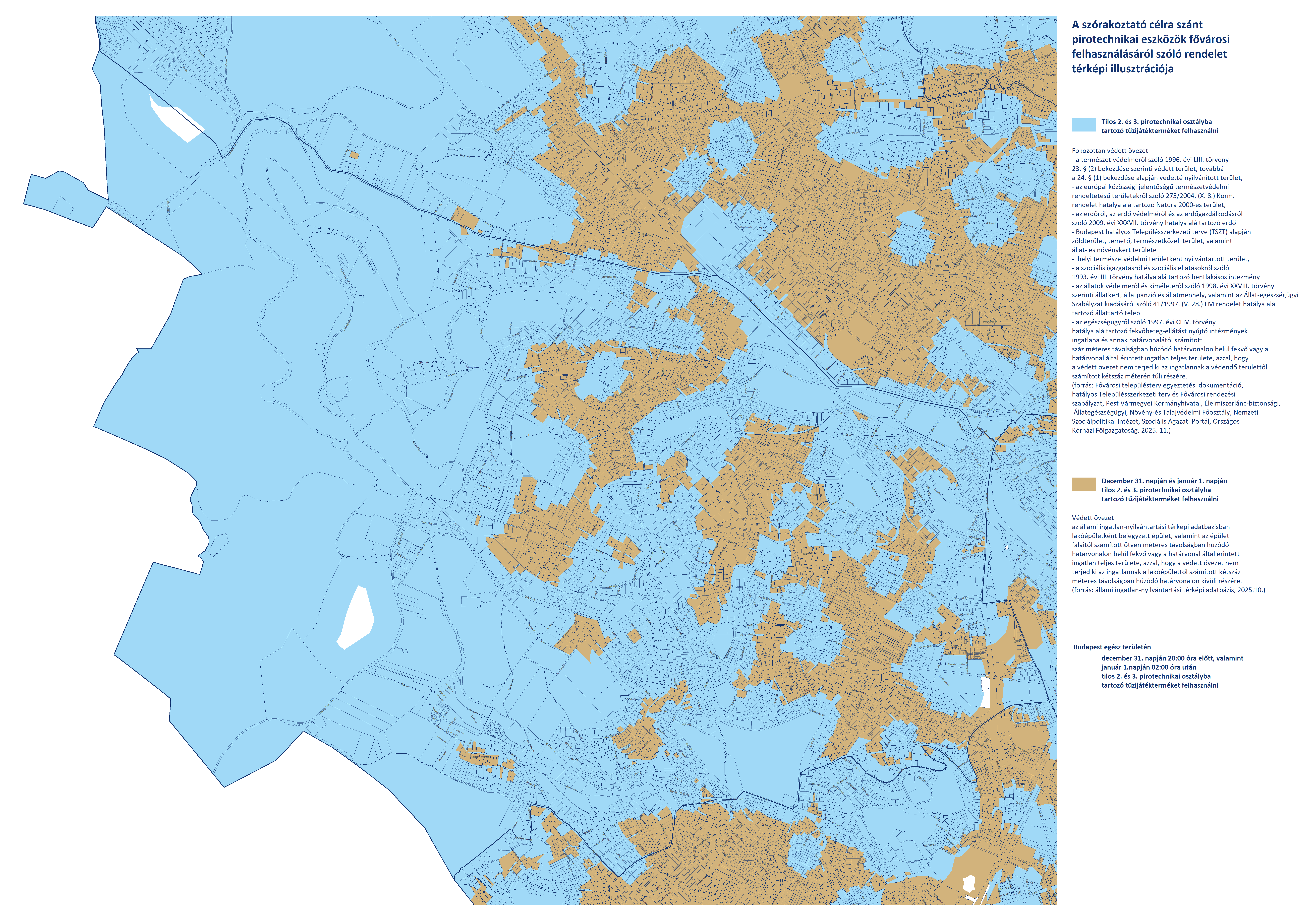 - a védett (barnával jelölt) övezetekben, azaz a lakóingatlanok ötvenméteres körzetében teljes tiltás fog vonatkozni december 31-én és január 1-jén.